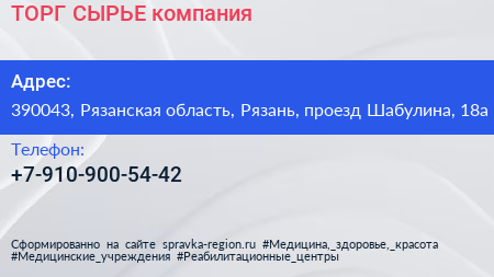 ТОРГ-СЫРЬЕ, компания по адресу 390043, Рязанская область, Рязань, проезд Шабулина, 18а в дальнейшем Организация, размещена в следующих категориях: