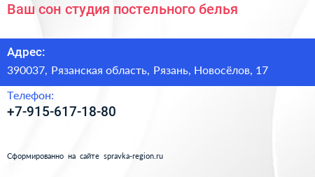 Ваш сон, студия постельного белья по адресу 390037, Рязанская область, Рязань, Новосёлов, 17 в дальнейшем Организация, размещена в следующих категориях: