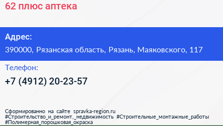 62 плюс, аптека по адресу 390000, Рязанская область, Рязань, Маяковского, 117 в дальнейшем Организация, размещена в следующих категориях: