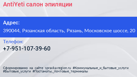 AntiYeti, салон эпиляции по адресу 390044, Рязанская область, Рязань, Московское шоссе, 20 в дальнейшем Организация, размещена в следующих категориях: