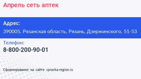 Апрель, сеть аптек по адресу 390005, Рязанская область, Рязань, Дзержинского, 51-53 в дальнейшем Организация, размещена в следующих категориях: