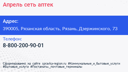 Апрель, сеть аптек по адресу 390005, Рязанская область, Рязань, Дзержинского, 73 в дальнейшем Организация, размещена в следующих категориях: