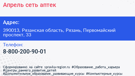 Апрель, сеть аптек по адресу 390013, Рязанская область, Рязань, Первомайский проспект, 33 в дальнейшем Организация, размещена в следующих категориях: