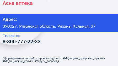 Асна, аптека по адресу 390027, Рязанская область, Рязань, Кальная, 37 в дальнейшем Организация, размещена в следующих категориях: