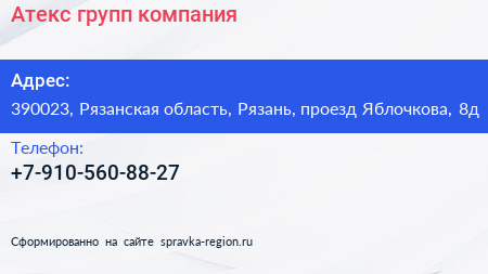Атекс групп, компания по адресу 390023, Рязанская область, Рязань, проезд Яблочкова, 8д в дальнейшем Организация, размещена в следующих категориях: