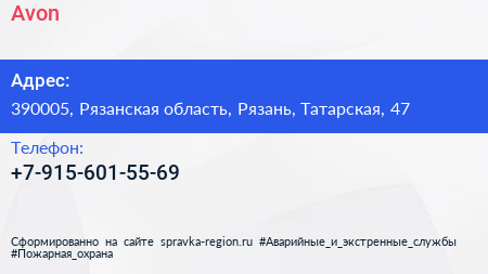Avon по адресу 390005, Рязанская область, Рязань, Татарская, 47 в дальнейшем Организация, размещена в следующих категориях: