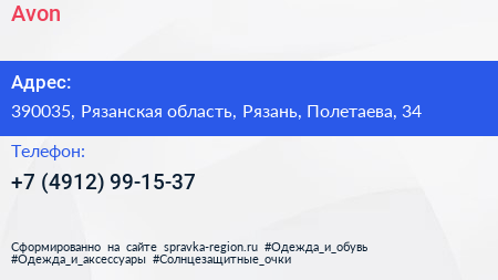 Avon по адресу 390035, Рязанская область, Рязань, Полетаева, 34 в дальнейшем Организация, размещена в следующих категориях: