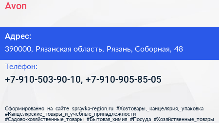 Avon по адресу 390000, Рязанская область, Рязань, Соборная, 48 в дальнейшем Организация, размещена в следующих категориях: