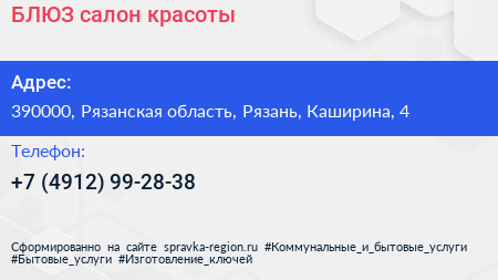 БЛЮЗ, салон красоты по адресу 390000, Рязанская область, Рязань, Каширина, 4 в дальнейшем Организация, размещена в следующих категориях: