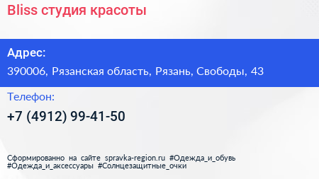Bliss, студия красоты по адресу 390006, Рязанская область, Рязань, Свободы, 43 в дальнейшем Организация, размещена в следующих категориях:
