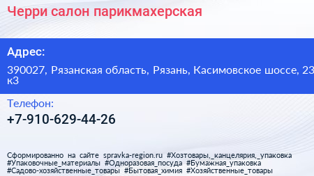 Черри, салон-парикмахерская по адресу 390027, Рязанская область, Рязань, Касимовское шоссе, 23 к3 в дальнейшем Организация, размещена в следующих категориях: