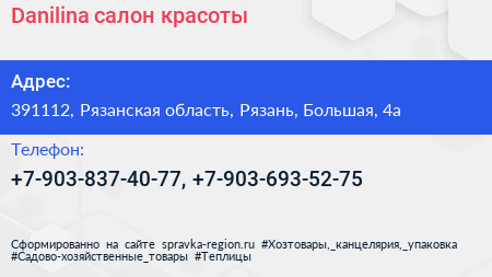 Danilina, салон красоты по адресу 391112, Рязанская область, Рязань, Большая, 4а в дальнейшем Организация, размещена в следующих категориях: