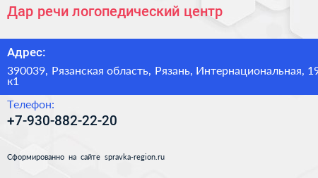 Дар речи, логопедический центр по адресу 390039, Рязанская область, Рязань, Интернациональная, 19 к1 в дальнейшем Организация, размещена в следующих категориях: