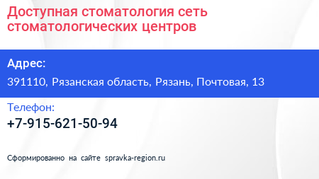 Доступная стоматология, сеть стоматологических центров по адресу 391110, Рязанская область, Рязань, Почтовая, 13 в дальнейшем Организация, размещена в следующих категориях: