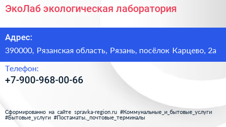 ЭкоЛаб, экологическая лаборатория по адресу 390000, Рязанская область, Рязань, посёлок Карцево, 2а в дальнейшем Организация, размещена в следующих категориях: