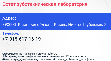 Эстет, зуботехническая лаборатория по адресу 390000, Рязанская область, Рязань, Нижне-Трубежная, 2 в дальнейшем Организация, размещена в следующих категориях:
