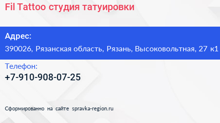 Fil Tattoo, студия татуировки по адресу 390026, Рязанская область, Рязань, Высоковольтная, 27 к1 в дальнейшем Организация, размещена в следующих категориях: