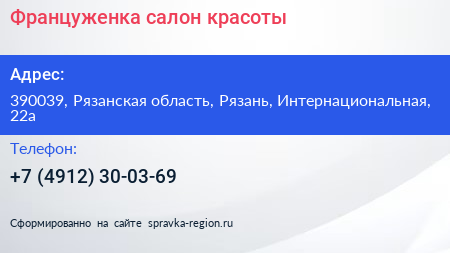 Француженка, салон красоты по адресу 390039, Рязанская область, Рязань, Интернациональная, 22а в дальнейшем Организация, размещена в следующих категориях: