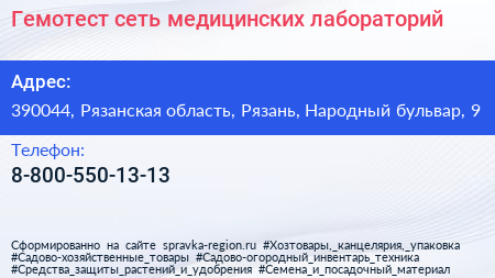 Гемотест, сеть медицинских лабораторий по адресу 390044, Рязанская область, Рязань, Народный бульвар, 9 в дальнейшем Организация, размещена в следующих категориях: