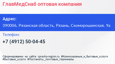 ГлавМедСнаб, оптовая компания по адресу 390006, Рязанская область, Рязань, Скоморошинская, 9а в дальнейшем Организация, размещена в следующих категориях:
