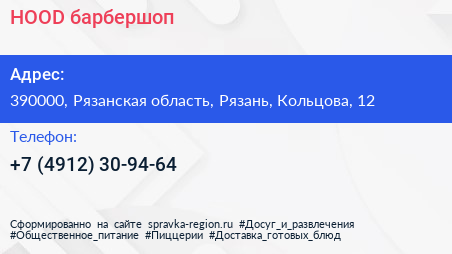 HOOD, барбершоп по адресу 390000, Рязанская область, Рязань, Кольцова, 12 в дальнейшем Организация, размещена в следующих категориях: