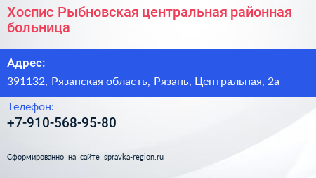 Хоспис, Рыбновская центральная районная больница по адресу 391132, Рязанская область, Рязань, Центральная, 2а в дальнейшем Организация, размещена в следующих категориях: