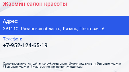 Жасмин, салон красоты по адресу 391110, Рязанская область, Рязань, Почтовая, 6 в дальнейшем Организация, размещена в следующих категориях: