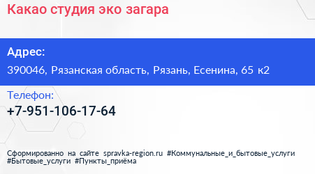 Какао, студия эко-загара по адресу 390046, Рязанская область, Рязань, Есенина, 65 к2 в дальнейшем Организация, размещена в следующих категориях: