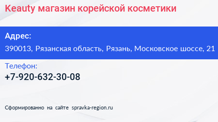 Keauty, магазин корейской косметики по адресу 390013, Рязанская область, Рязань, Московское шоссе, 21 в дальнейшем Организация, размещена в следующих категориях: