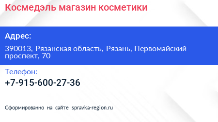 Космедэль, магазин косметики по адресу 390013, Рязанская область, Рязань, Первомайский проспект, 70 в дальнейшем Организация, размещена в следующих категориях: