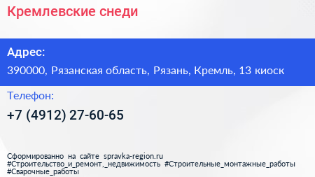 Кремлевские снеди по адресу 390000, Рязанская область, Рязань, Кремль, 13 киоск в дальнейшем Организация, размещена в следующих категориях: