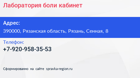Лаборатория боли, кабинет по адресу 390000, Рязанская область, Рязань, Сенная, 8 в дальнейшем Организация, размещена в следующих категориях:
