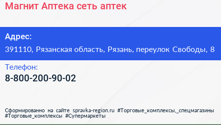 Магнит Аптека, сеть аптек по адресу 391110, Рязанская область, Рязань, переулок Свободы, 8 в дальнейшем Организация, размещена в следующих категориях: