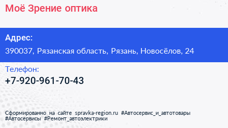 Моё Зрение, оптика по адресу 390037, Рязанская область, Рязань, Новосёлов, 24 в дальнейшем Организация, размещена в следующих категориях: