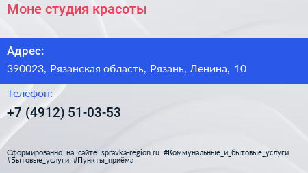 Моне, студия красоты по адресу 390023, Рязанская область, Рязань, Ленина, 10 в дальнейшем Организация, размещена в следующих категориях: