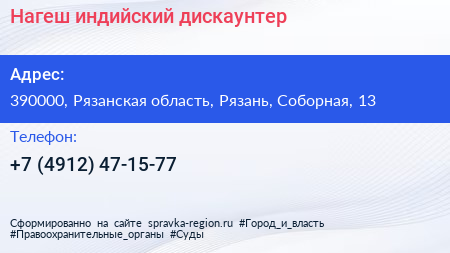 Нагеш, индийский дискаунтер по адресу 390000, Рязанская область, Рязань, Соборная, 13 в дальнейшем Организация, размещена в следующих категориях: