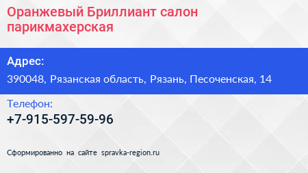 Оранжевый Бриллиант, салон-парикмахерская по адресу 390048, Рязанская область, Рязань, Песоченская, 14 в дальнейшем Организация, размещена в следующих категориях: