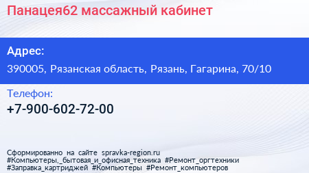 Панацея62, массажный кабинет по адресу 390005, Рязанская область, Рязань, Гагарина, 70/10 в дальнейшем Организация, размещена в следующих категориях:
