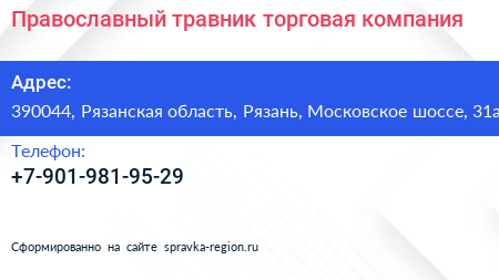 Православный травник, торговая компания по адресу 390044, Рязанская область, Рязань, Московское шоссе, 31а в дальнейшем Организация, размещена в следующих категориях: