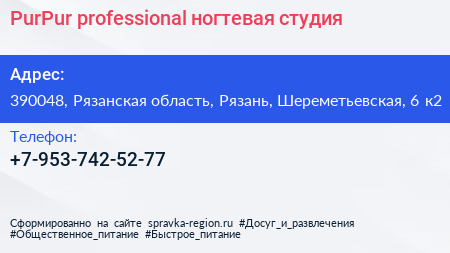 PurPur professional, ногтевая студия по адресу 390048, Рязанская область, Рязань, Шереметьевская, 6 к2 в дальнейшем Организация, размещена в следующих категориях: