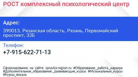 РОСТ, комплексный психологический центр по адресу 390013, Рязанская область, Рязань, Первомайский проспект, 33Б в дальнейшем Организация, размещена в следующих категориях: