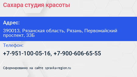 Сахара, студия красоты по адресу 390013, Рязанская область, Рязань, Первомайский проспект, 33Б в дальнейшем Организация, размещена в следующих категориях: