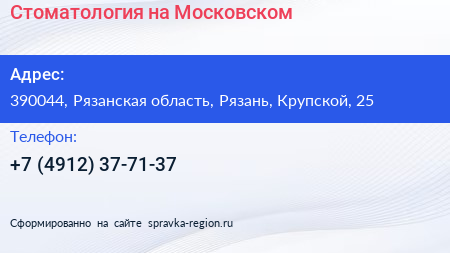 Стоматология на Московском по адресу 390044, Рязанская область, Рязань, Крупской, 25 в дальнейшем Организация, размещена в следующих категориях: