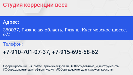 Студия коррекции веса по адресу 390037, Рязанская область, Рязань, Касимовское шоссе, 67а в дальнейшем Организация, размещена в следующих категориях: