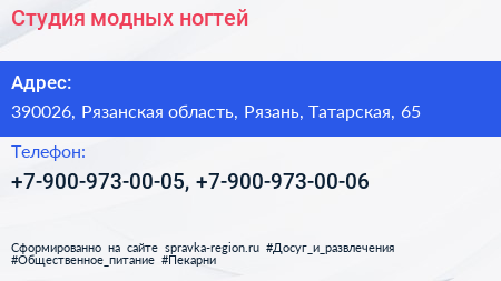Студия модных ногтей по адресу 390026, Рязанская область, Рязань, Татарская, 65 в дальнейшем Организация, размещена в следующих категориях:
