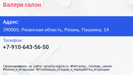 Валери, салон по адресу 390005, Рязанская область, Рязань, Пушкина, 14 в дальнейшем Организация, размещена в следующих категориях: