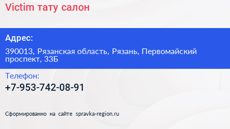 Victim, тату-салон по адресу 390013, Рязанская область, Рязань, Первомайский проспект, 33Б в дальнейшем Организация, размещена в следующих категориях: