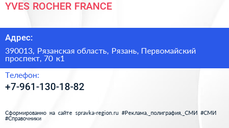 YVES ROCHER FRANCE по адресу 390013, Рязанская область, Рязань, Первомайский проспект, 70 к1 в дальнейшем Организация, размещена в следующих категориях:
