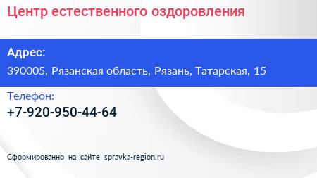 Центр естественного оздоровления по адресу 390005, Рязанская область, Рязань, Татарская, 15 в дальнейшем Организация, размещена в следующих категориях: