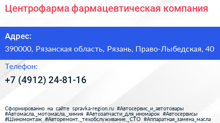 Центрофарма, фармацевтическая компания по адресу 390000, Рязанская область, Рязань, Право-Лыбедская, 40 в дальнейшем Организация, размещена в следующих категориях: